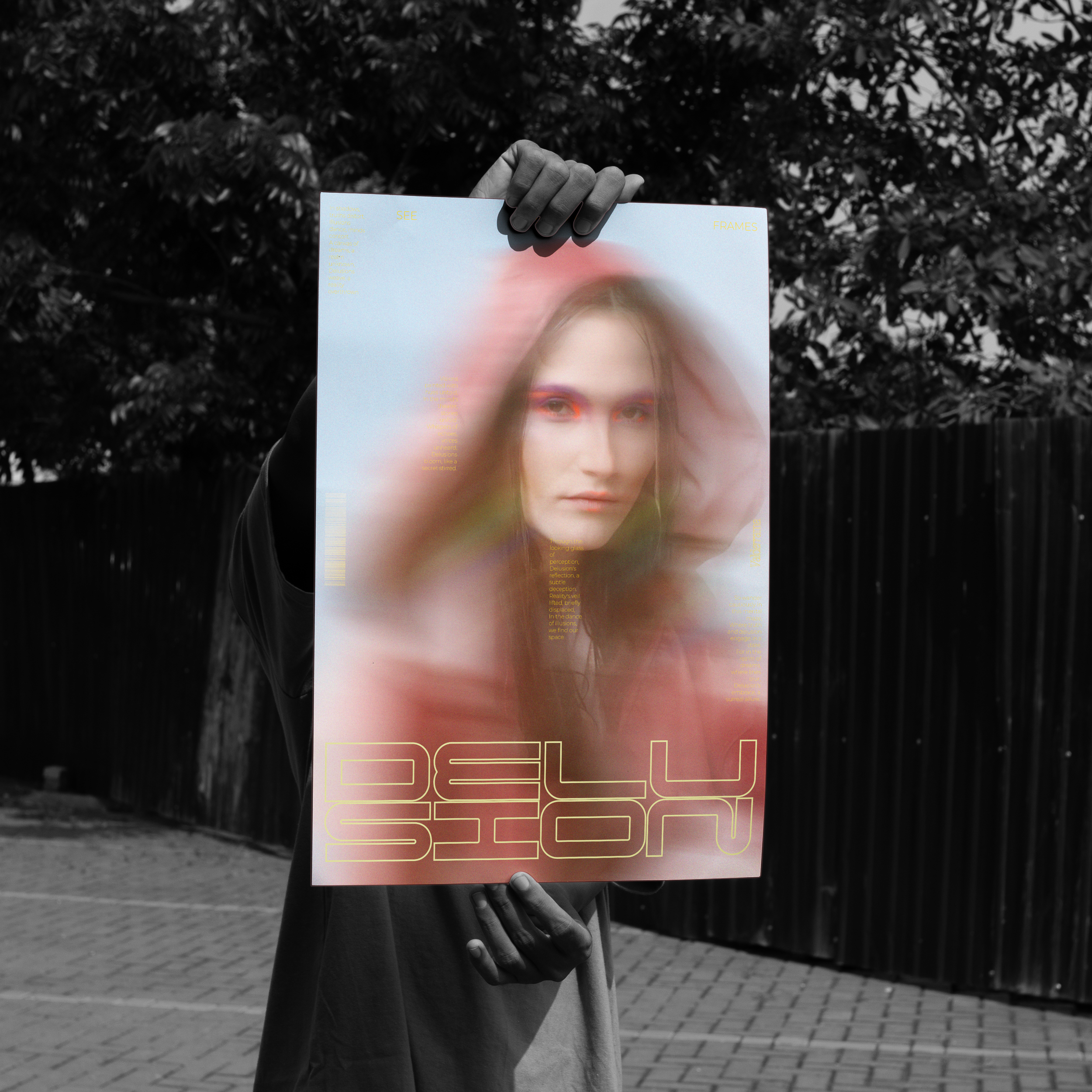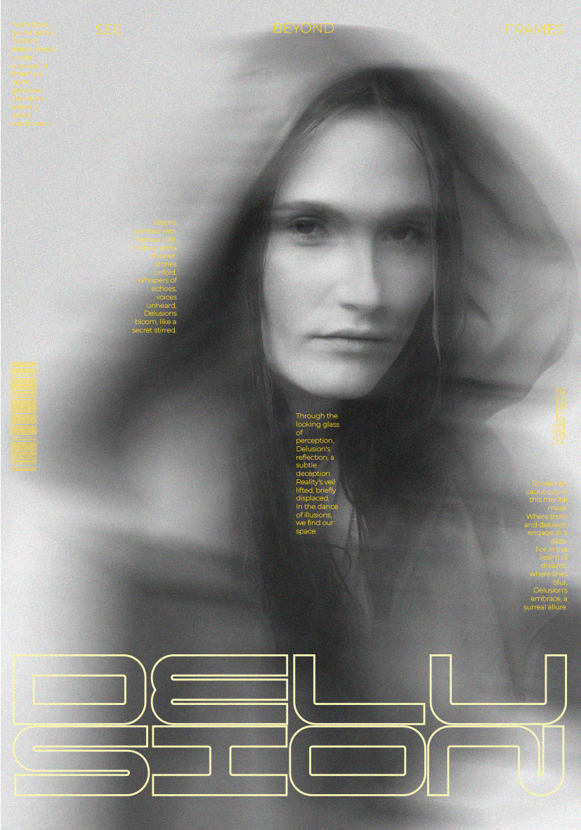 "DELUSION" is an editorial photo project that explores the concept of delusion. Through carefully constructed compositions and post-production distortion effects, the five posters visually alter the perception of reality. Mirrored images, multiplied scenes, and disjointed backgrounds create a dreamlike, dissonant atmosphere.