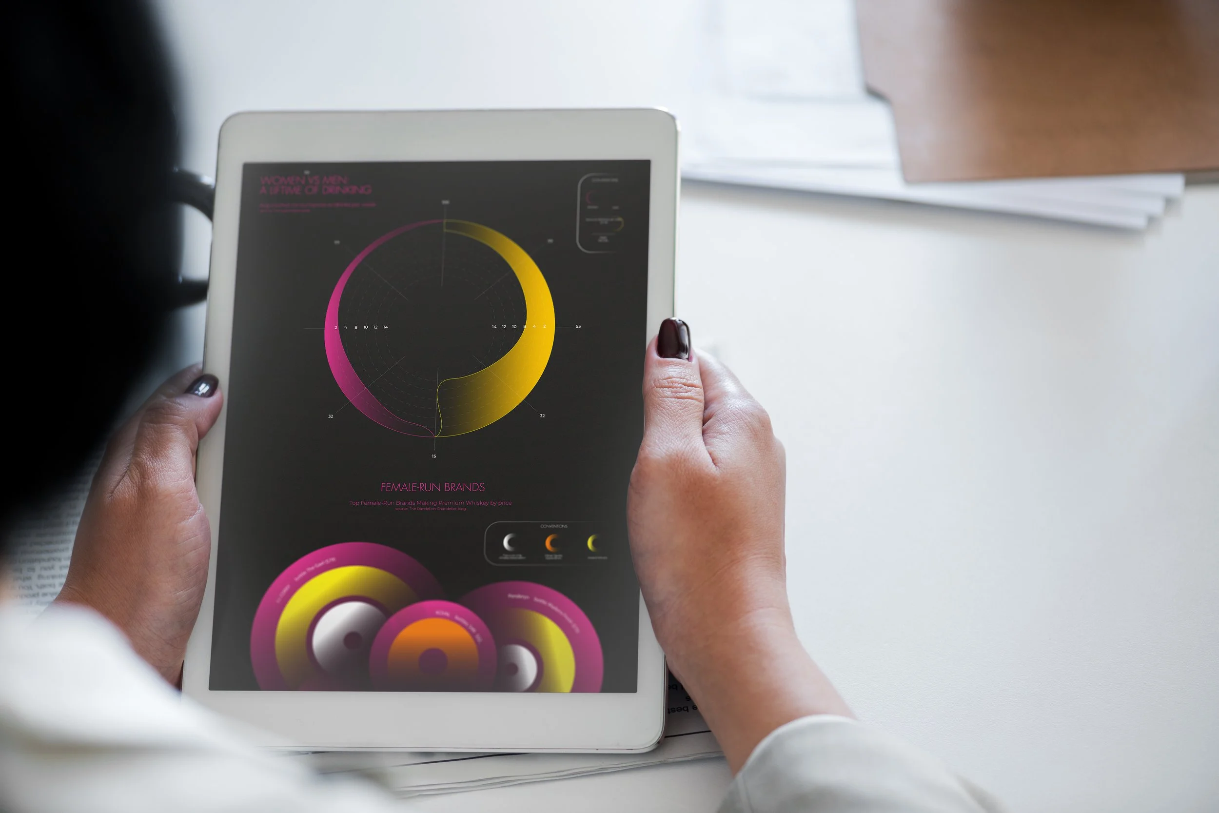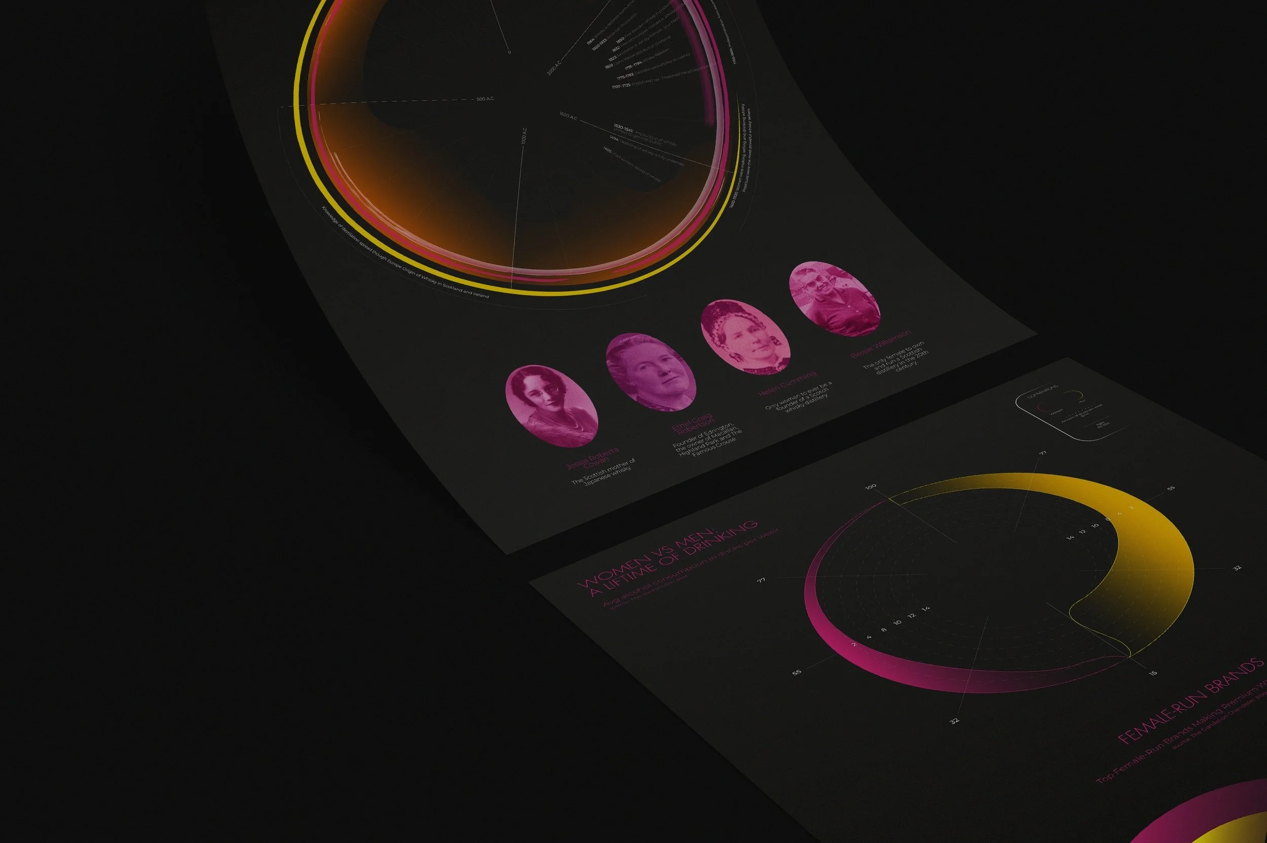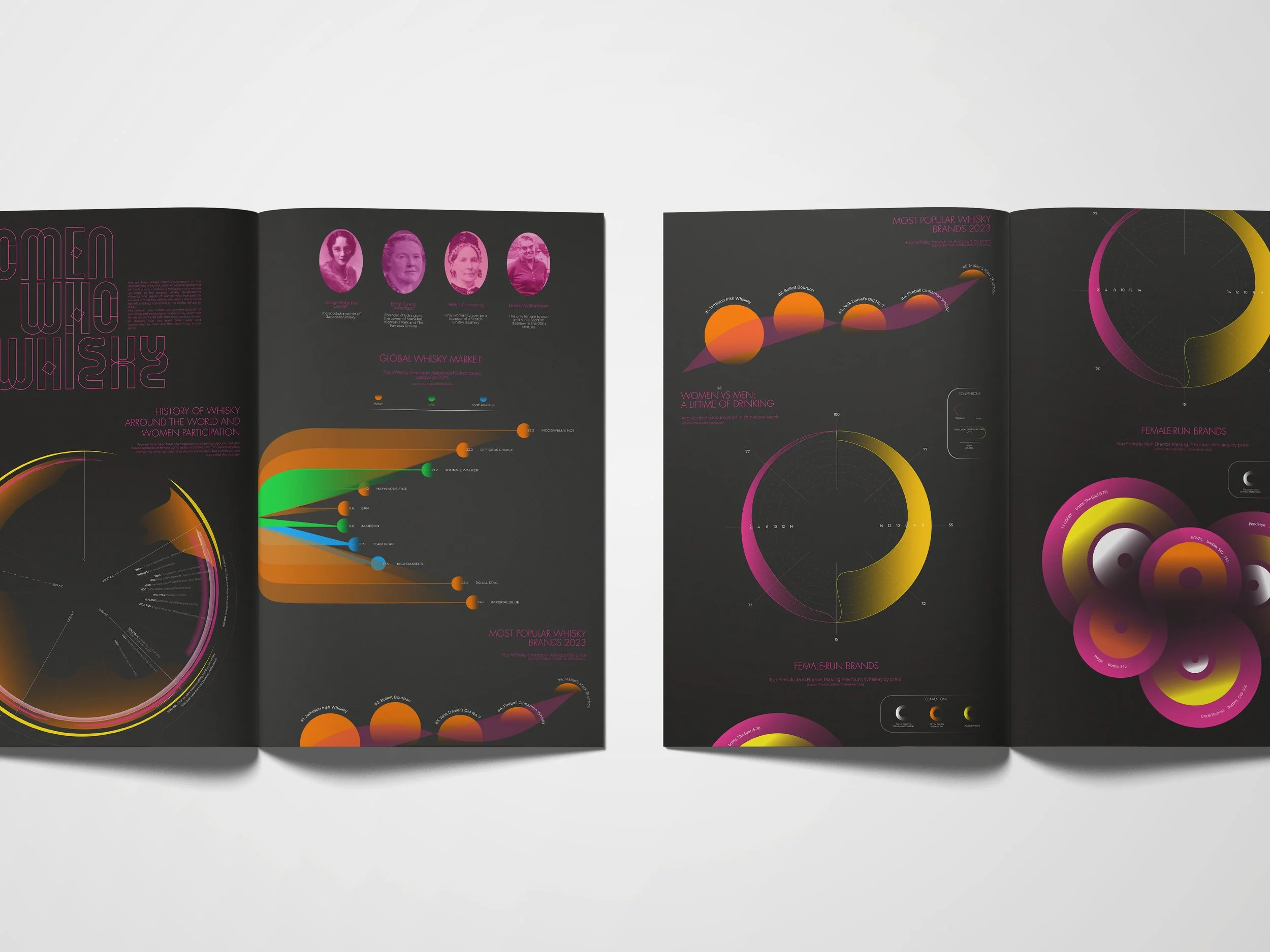In this infographic project, I explored the fascinating relationship between gender and whisky culture. Through detailed research on a whisky brand, I uncovered intriguing facts about whisky production and the historical roles of different genders. Traditionally regarded as a "man's drink," whisky is now embraced by growing communities of women who challenge this stereotype.